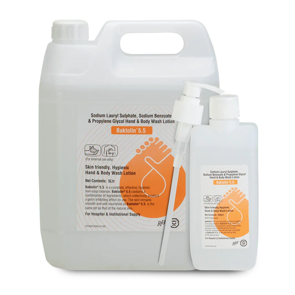 Baktolin 5.5® is a skin friendly “soap free” hygienic wash lotion that is effective and with the same pH as that of the skin! It is specially designed for frequent hand washers, for cleansing of visible dirt & significant germ reduction. Even on intensive use of the product, the skin remains well nourished. It contains no color, no alkali soap ingredients and leaves behind a pleasant fragrance. One bottle gives 1000 hand washes.