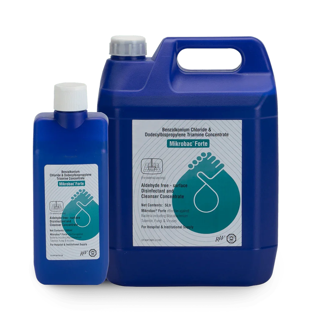 Mikrobac forte is an aldehyde-free, 5th Generation QAC, surface disinfectant cleaner concentrate for OT, ICU, ICCU. It is suitable for all water-resistant, wipeable objects, medical equipment & the surfaces of walls and floors. Its broad range of activity & neutral odor makes it ideal for use in odor sensitive or patient-related areas. It is bactericidal, fungicidal, tuberculocidal & virucidal.