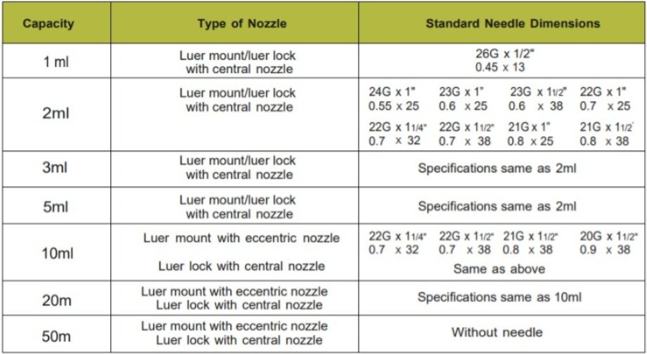 Needle Details: High-quality, 3-facet lancet point, siliconized stainless steel needles (SUS 304) to reduce resistance. Available in various gauges (16G to 27G) and lengths (e.g., 1 inch, 1.5 inch).